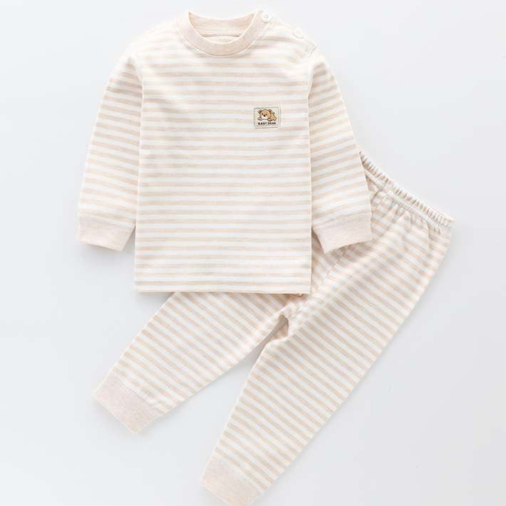 上品なベージュとホワイトのボーダー柄が魅力的な、親子で楽しめるパジャマです。