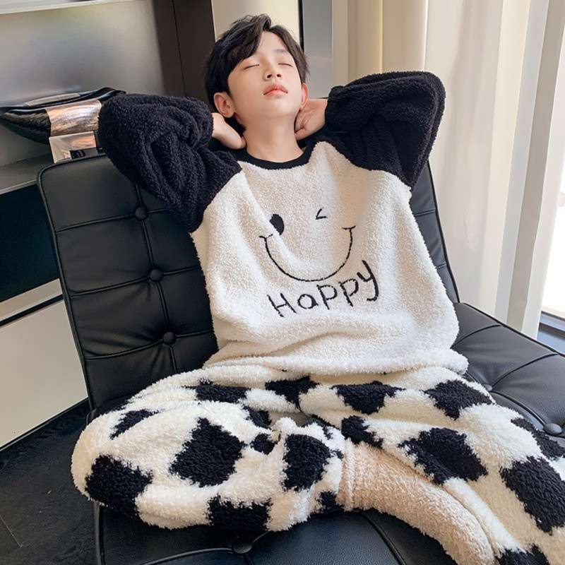 明るいスマイルマークがプリントされたこども用モコモコパジャマです。