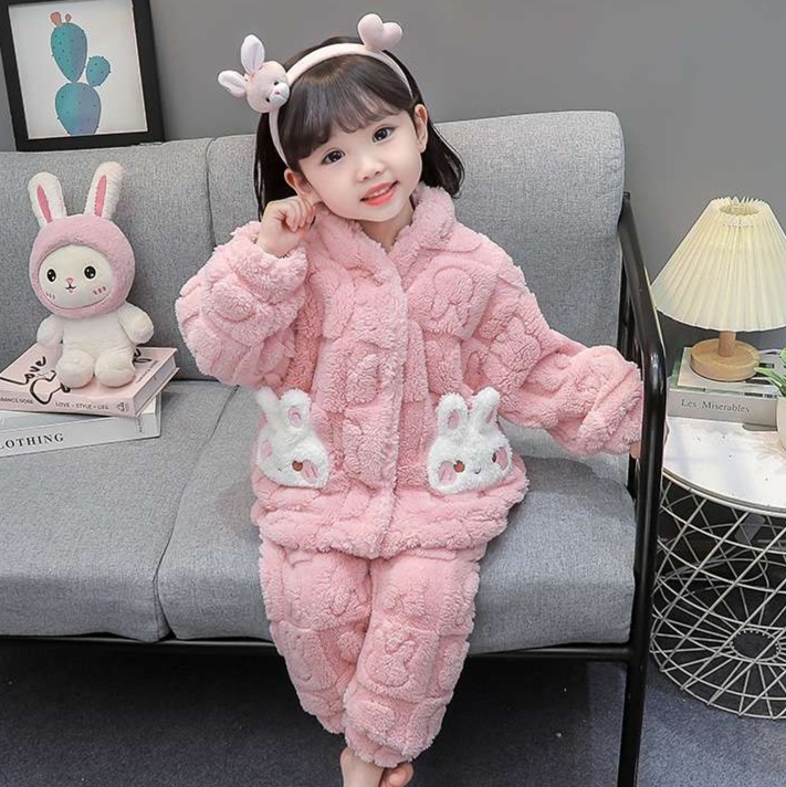 愛らしいウサギのデザインが印象的な、暖かいキッズパジャマの上下セットです。