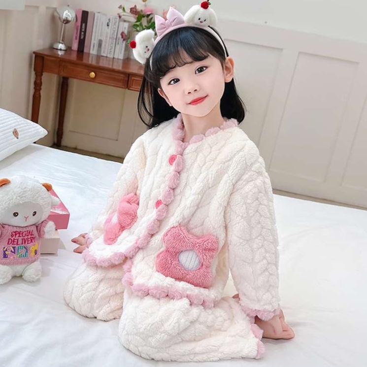 クリーム色ベースにピンクのアクセントが映える、もこもこ素材のガールズルームウェアです。