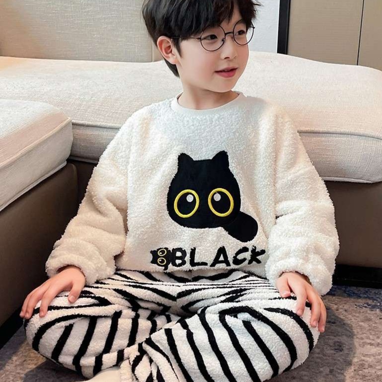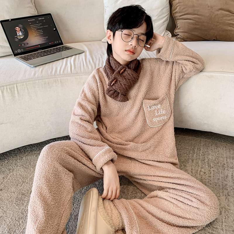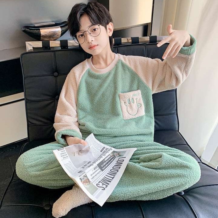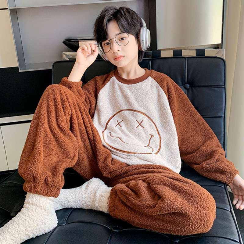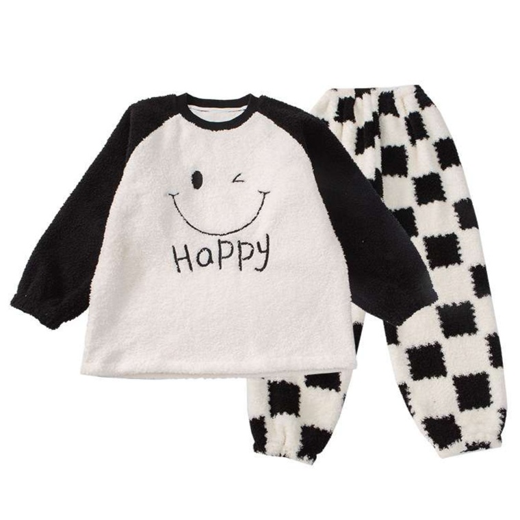 男児向けの冬用キッズパジャマは、ふわふわの素材が心地よい暖かさを実現。胸元にはウインクした笑顔と「はっぴー」の文字をあしらい、かわいらしさを引き立てます。チェック柄のパンツとの組み合わせが遊び心をプラスし、楽しい夢の世界へと誘います。寒い季節にぴったりなこのパジャマで、お子様の快適な睡眠をしっかりサポート。暖かな夜をお届けします。