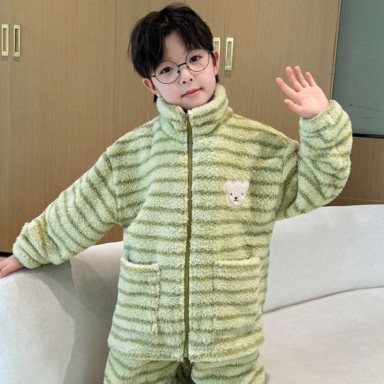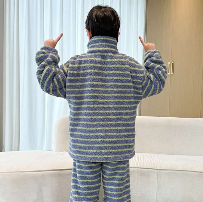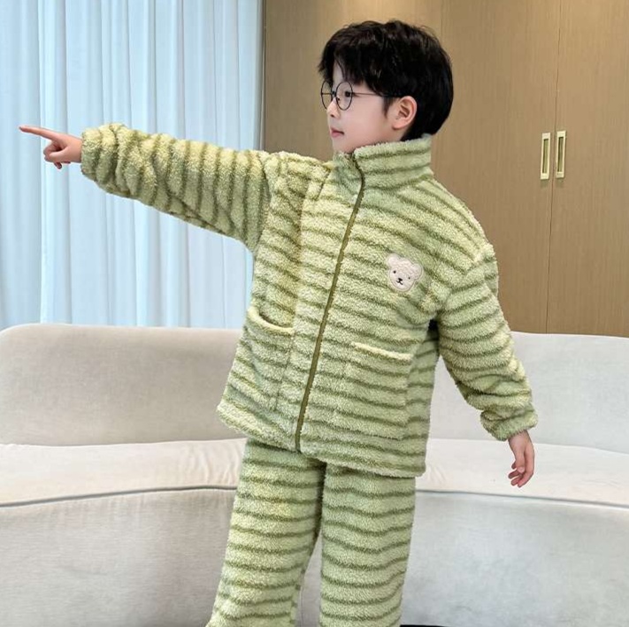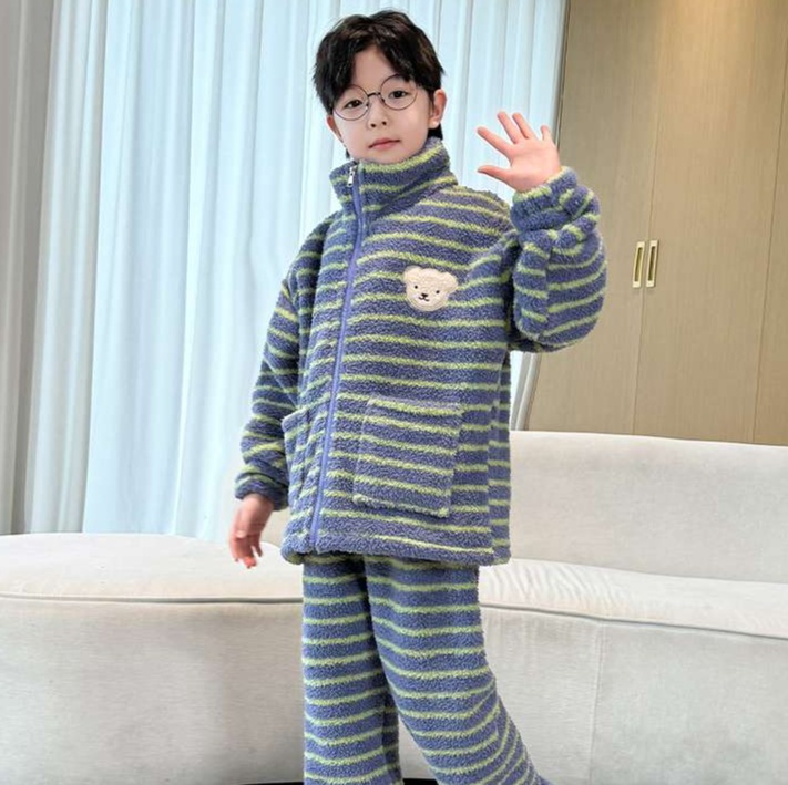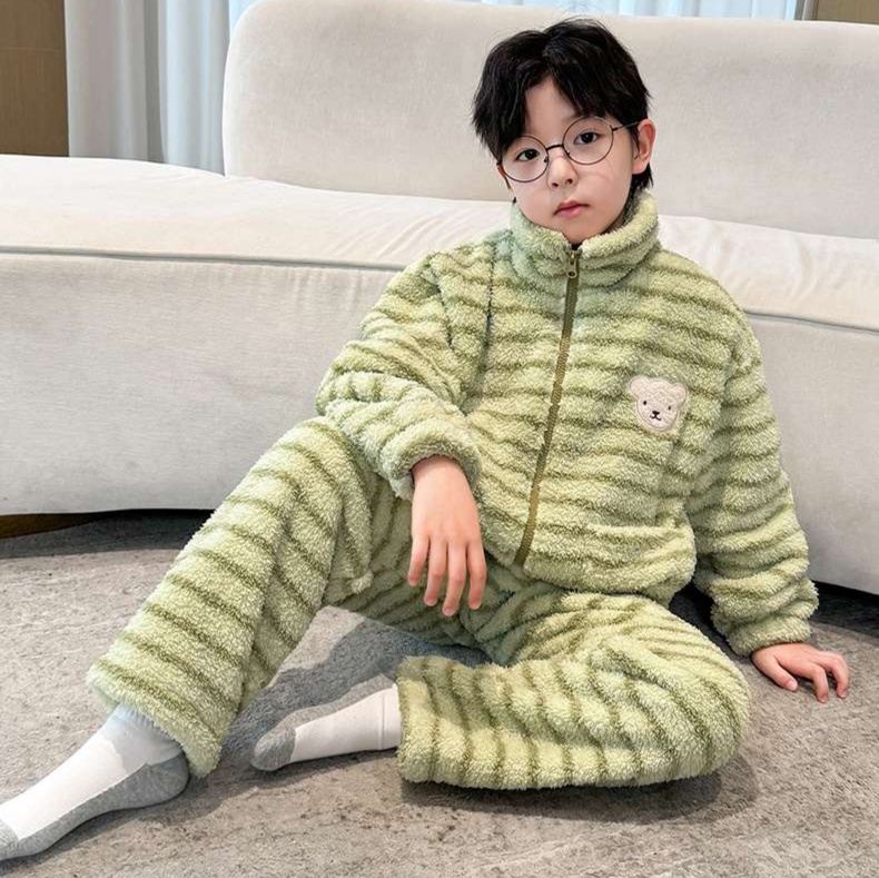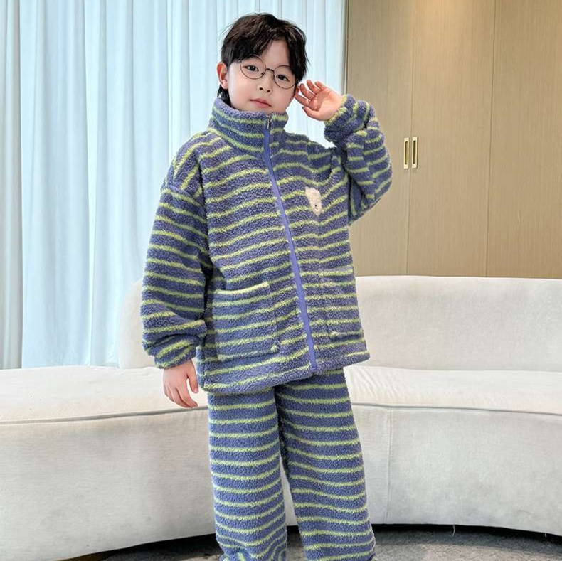 ふわふわの手触りが心地よい男児用冬パジャマ。縞模様の生地に、愛らしいクマのワンポイントがアクセント。寒い夜も暖かく過ごせるよう、保温性に優れた素材を採用。上下セットで、快適な眠りへと導きます。冬の夜のお供にぴったりな一着です。