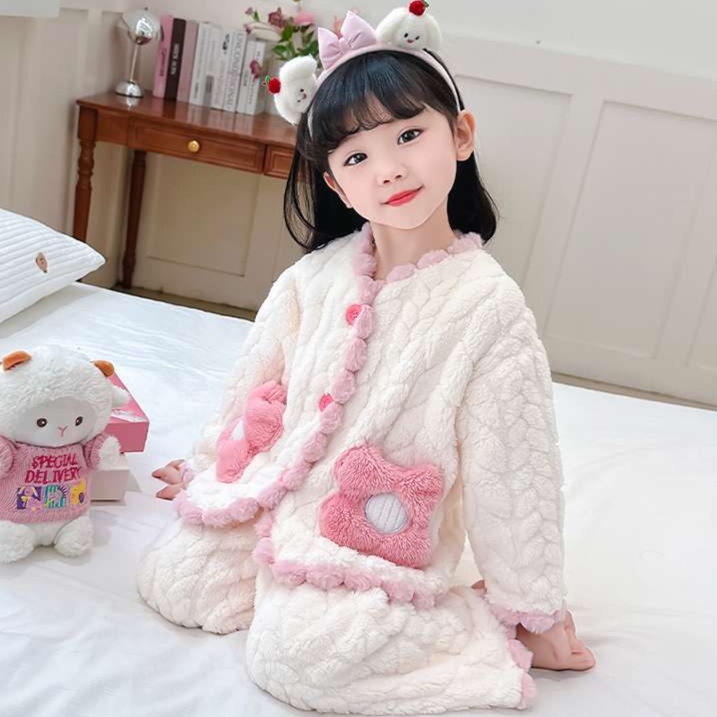この冬にぴったりの女児パジャマは、ふんわりとしたボアフリース素材を使用。寒い季節でも心地よい暖かさを提供します。かわいらしいウサギモチーフのカチューシャと、お花型のポケットが魅力的なアクセントに。ふわふわの生地感で、毎晩の眠りをより快適に演出。お子様が喜ぶデザインで、楽しい冬の夜をお約束します。