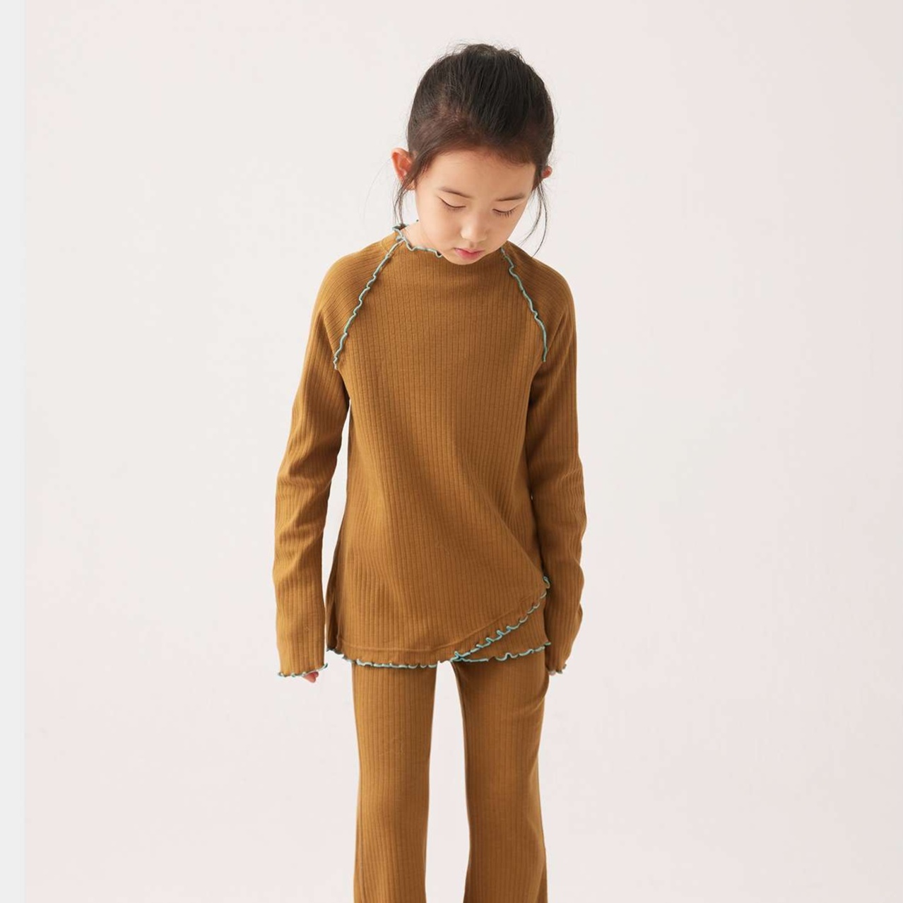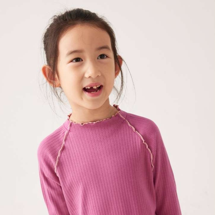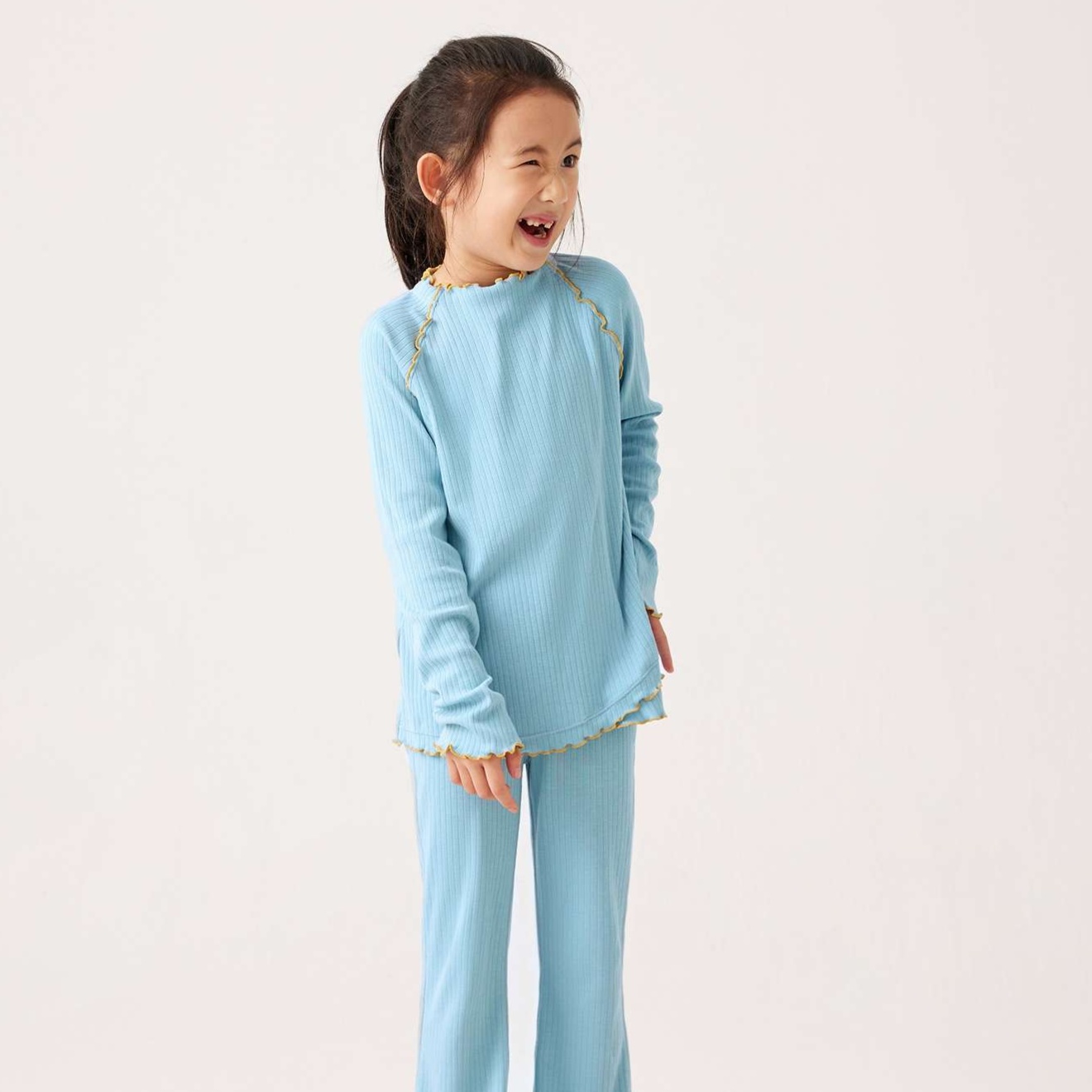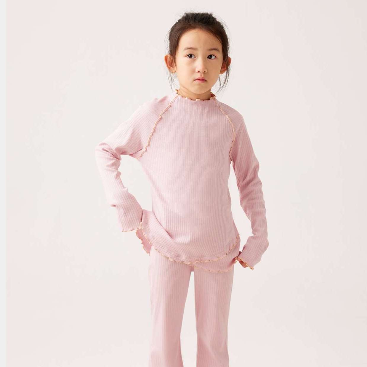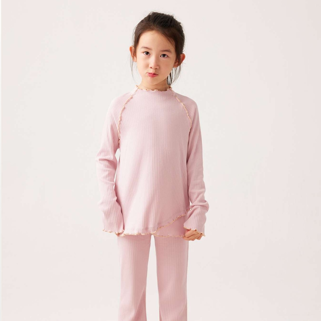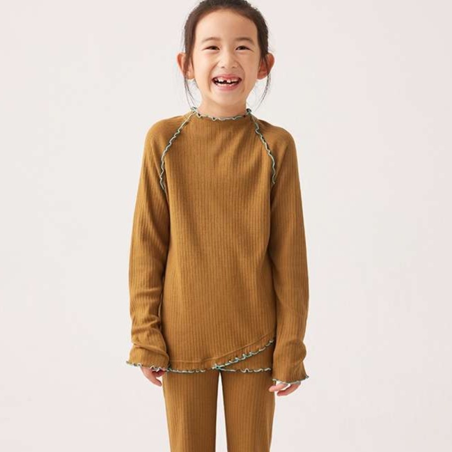 袖口や裾に施された波状の縁取りが、子供らしい可愛らしさを引き立てる上品なアクセントに