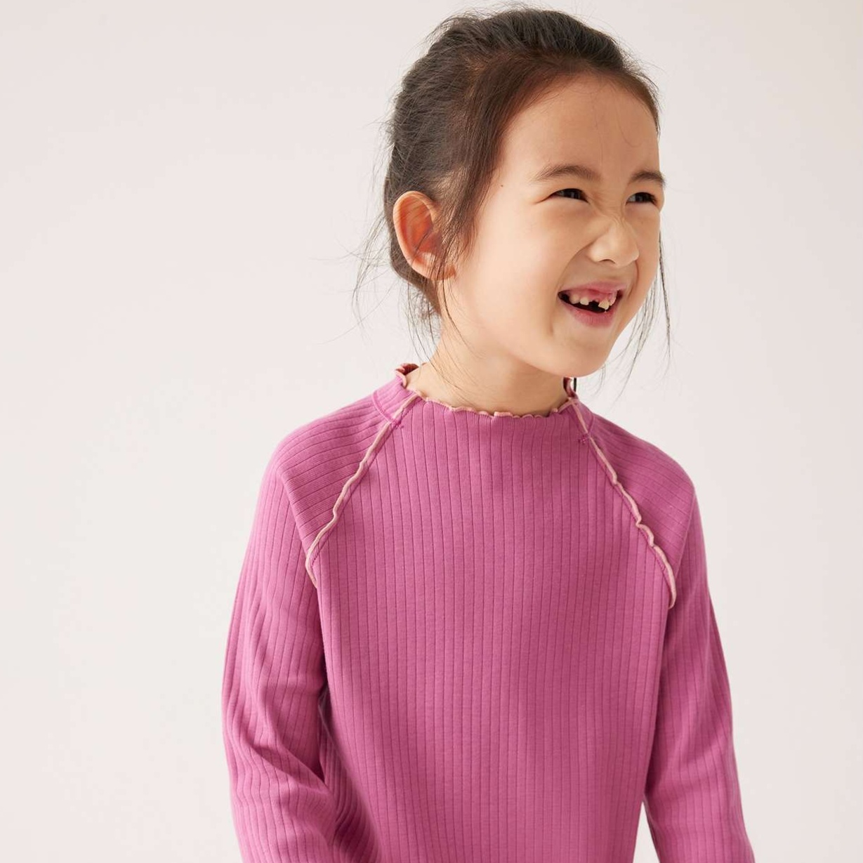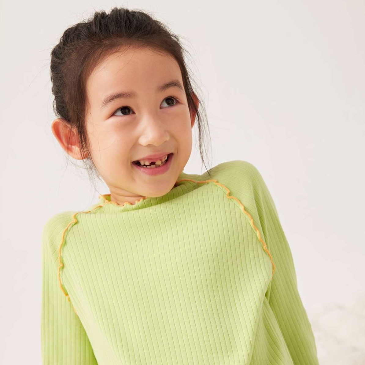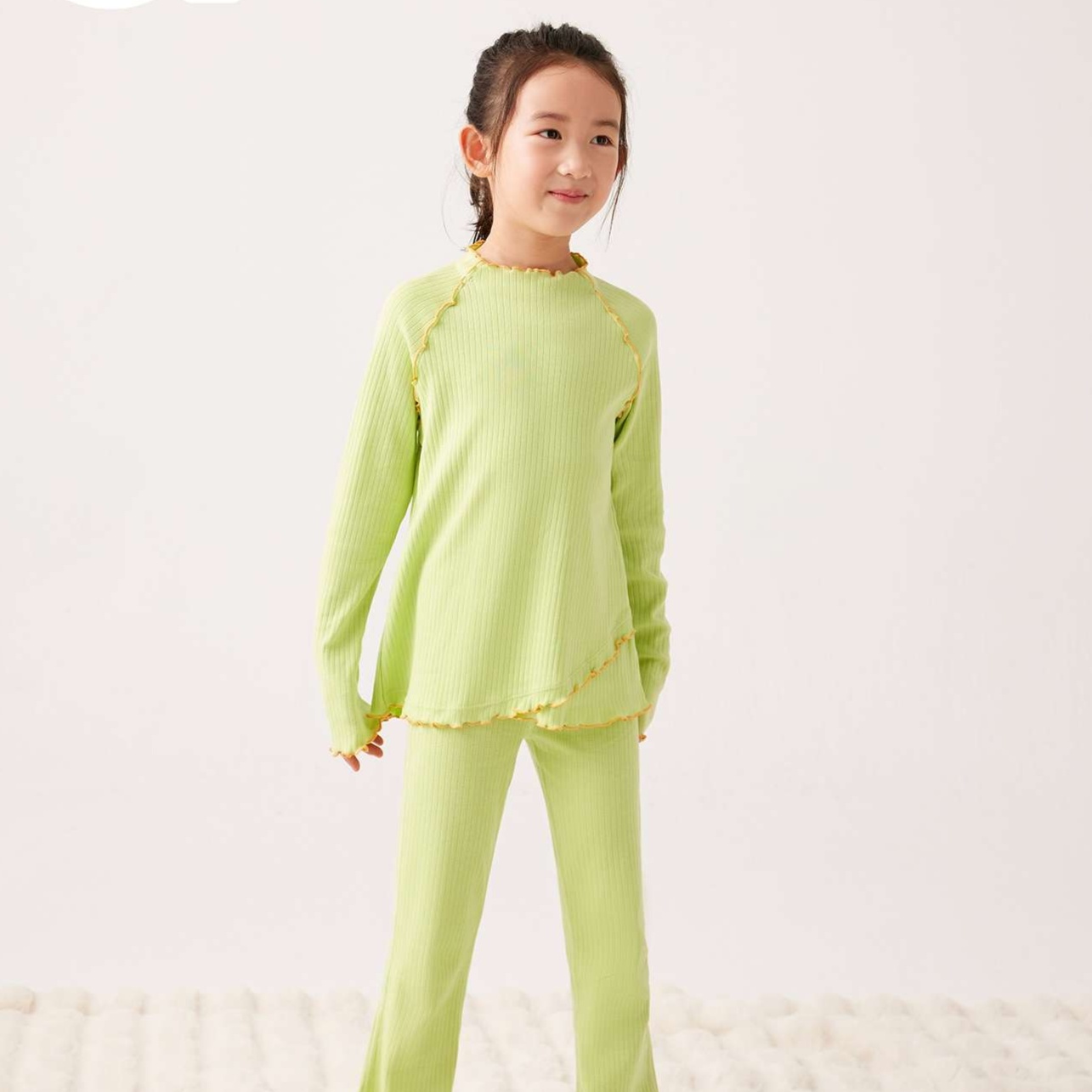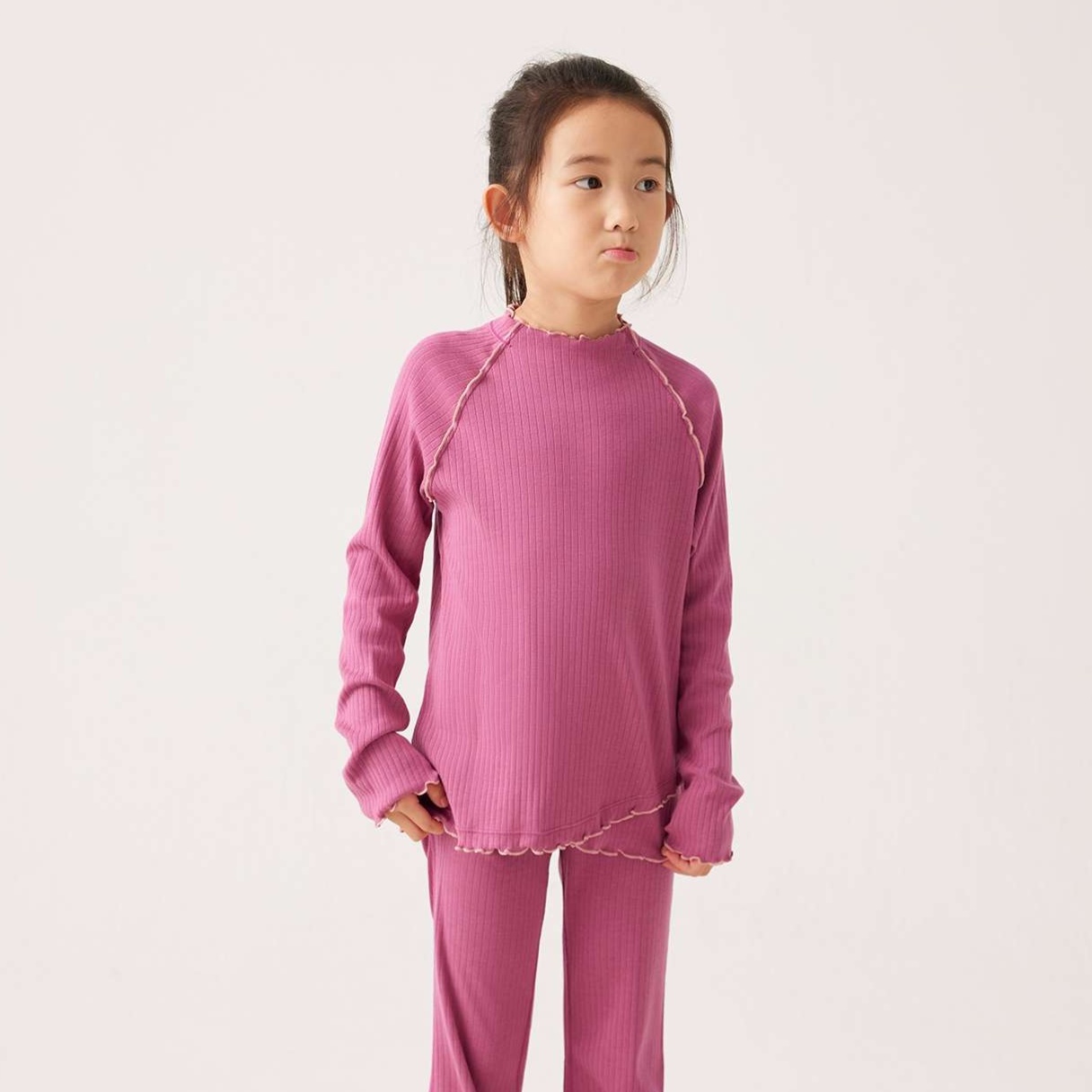 袖口や裾に施された波状の縁取りが、子供らしい可愛らしさを引き立てる上品なアクセントに