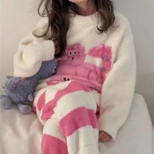 ピンクの可愛らしい猫のイラストが、パジャマ姿を優しく華やかに演出