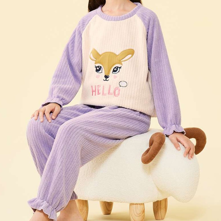 胸元の可愛らしいアニメ風キャラクターが、パジャマ全体の雰囲気を優しく演出します。