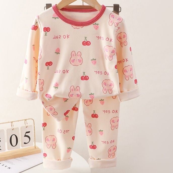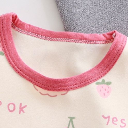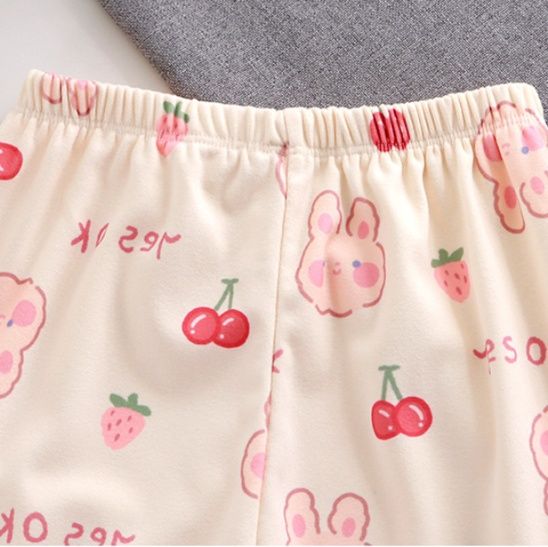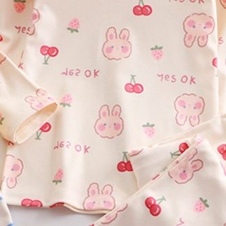うさぎやくま、フルーツ柄が全体に散りばめられた可愛らしいデザインで、お子様の心をときめかせます。