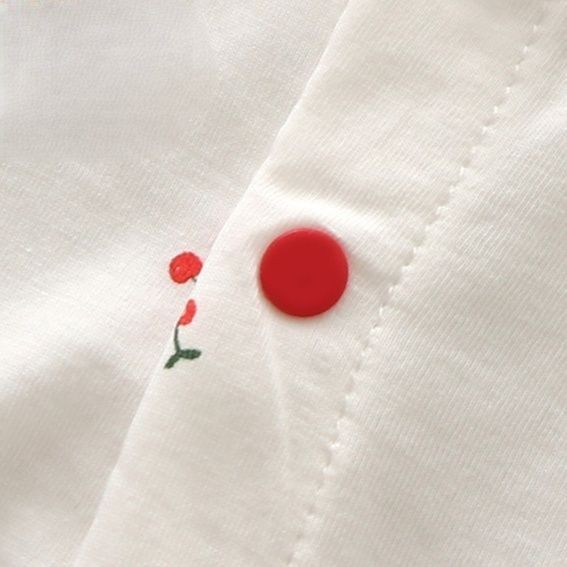 前開きボタン仕様で着脱しやすく、縁取りのパイピングがアクセントになっています。