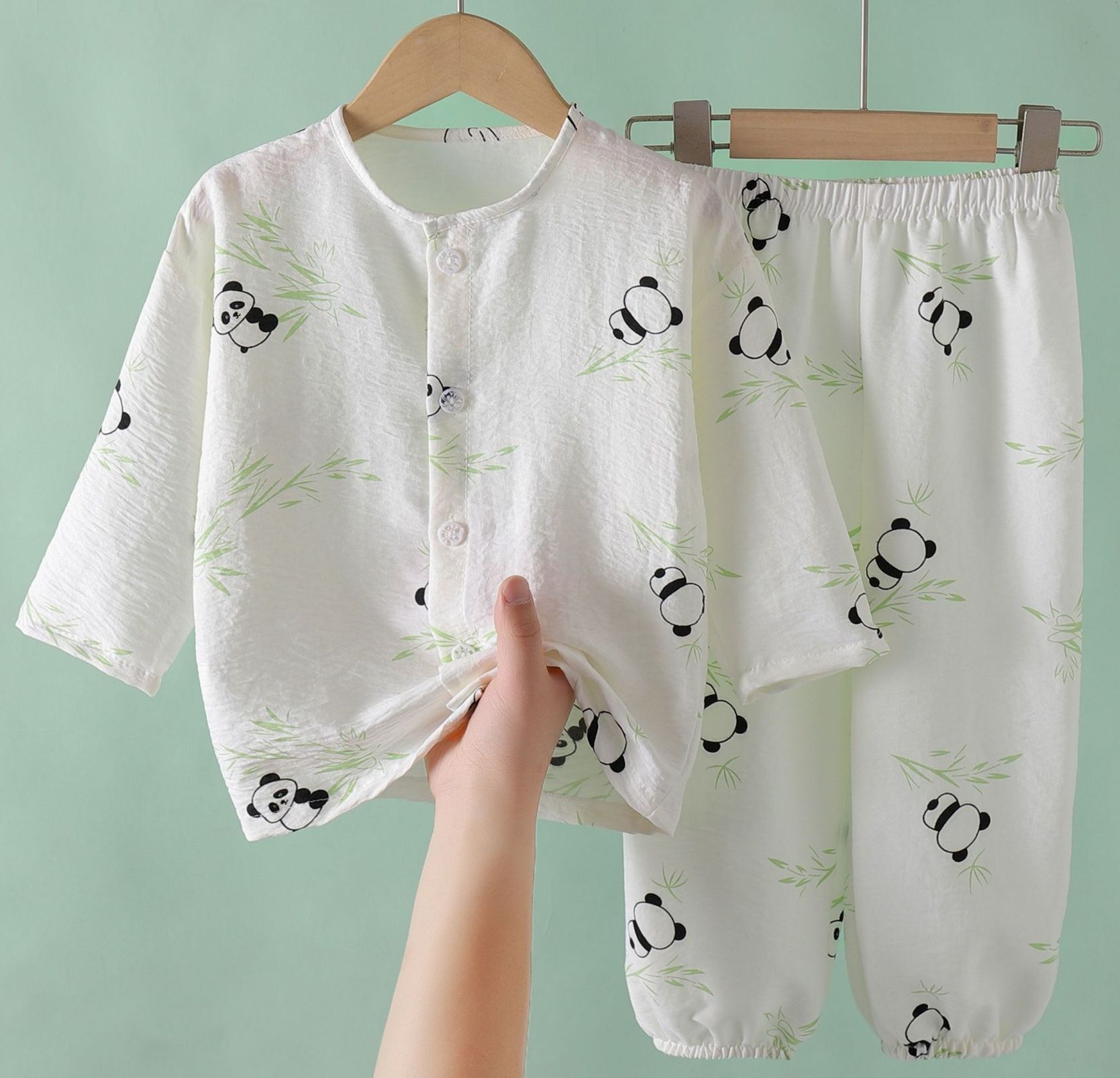 愛らしいパンダと竹の葉が描かれた子どもパジャマのセットアップ(上下セット)です。